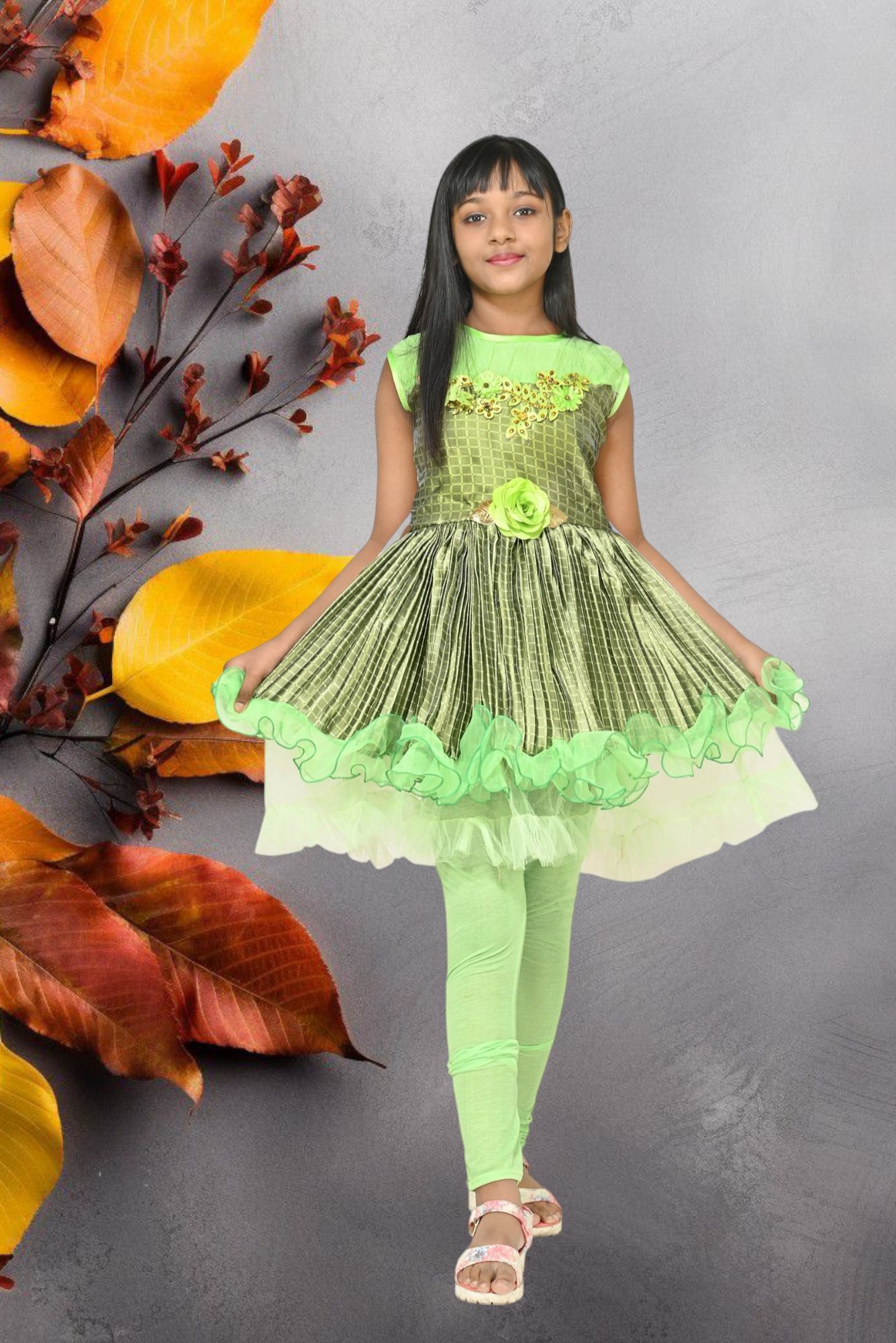 Dress your little princess in style with this elegant frock set from Aishani Collection. Designed for comfort and charm, this outfit features a beautifully pleated frock with floral embellishments and a matching flower belt, paired with soft leggings for a complete look. The layered frill hem adds a touch of grace, making it perfect for birthdays, festive occasions, and family gatherings.