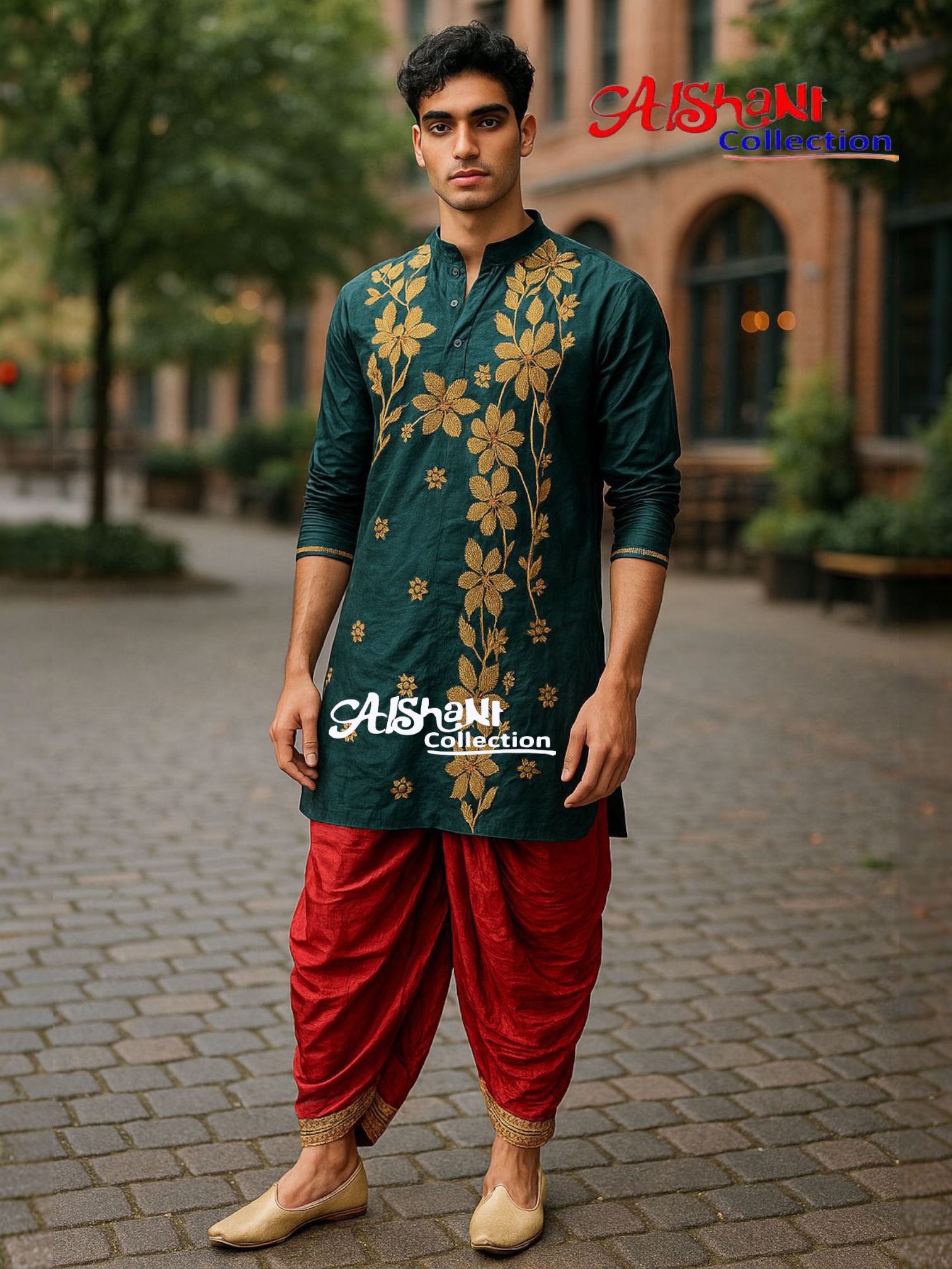 Aishani Collection Hand Embroidery Kantha Stitch Cotton Punjabi for Men Festive Collection (Dark Green)