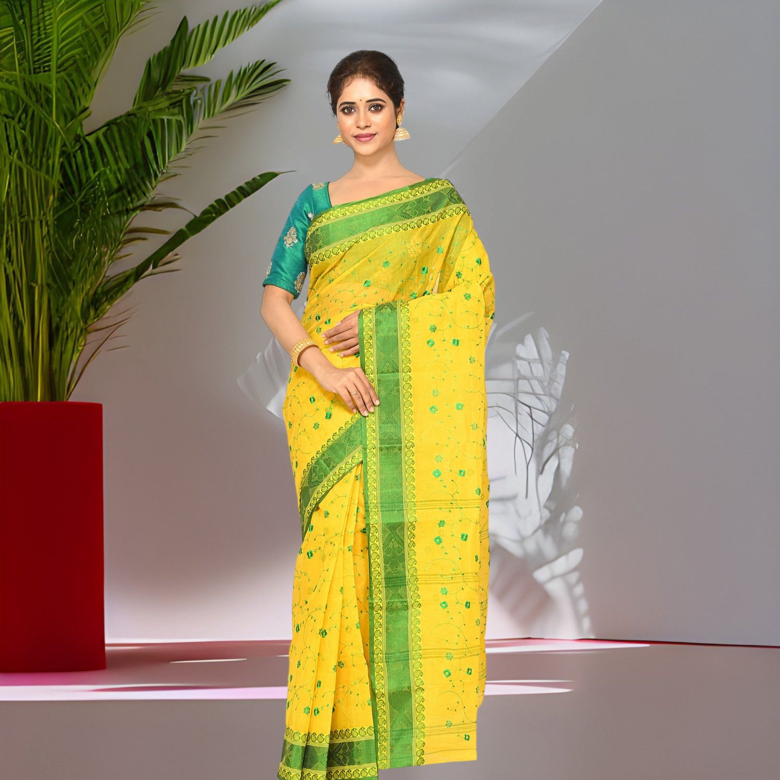 Made from pure lightweight cotton, it features a little starch finish that gives structure while keeping the drape soft and breathable—perfect for summer, daily wear, casual outings, festive moments, and traditional occasions. The contrast border adds a vibrant touch, enhancing its classic Tant aesthetic.