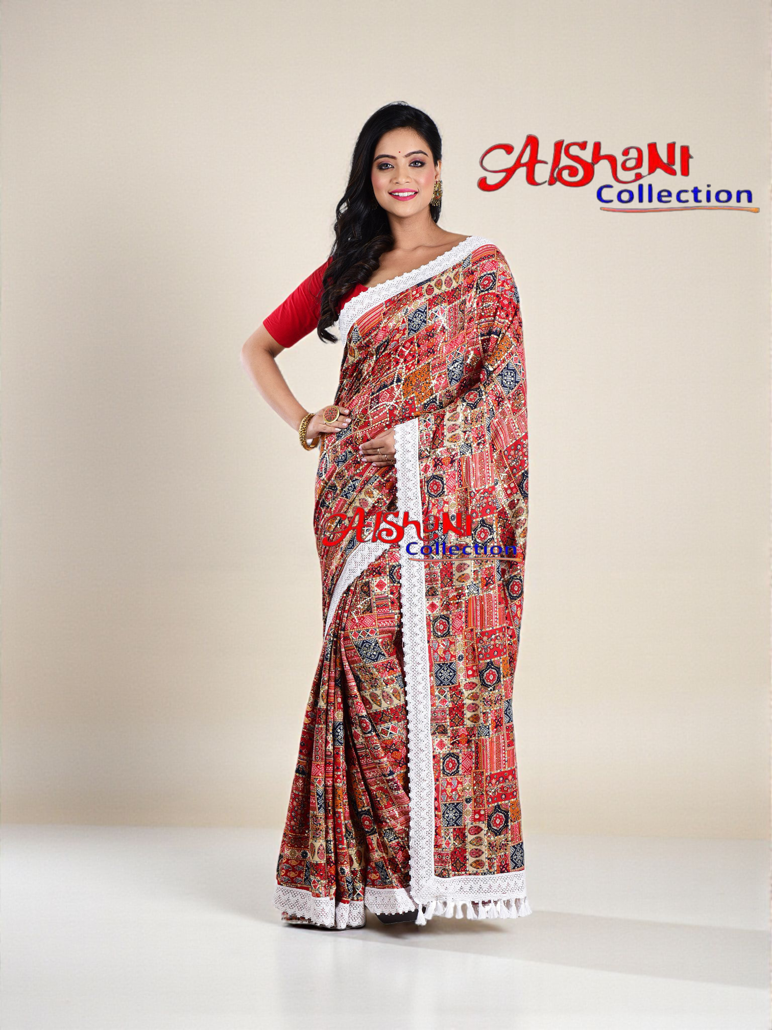Designed in smooth, lightweight silk, it drapes effortlessly and enhances your natural grace. The delicate lace border adds a refined charm, making the saree stand out with its subtle yet sophisticated detailing. Paired with a matching blouse piece, it allows you to style your look just the way you desire.