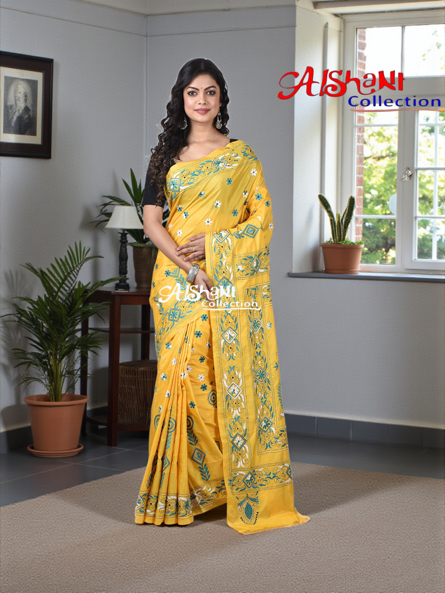 Blended Bangalore Silk Hand-Embroidered Kantha Stitch Saree with Blouse Piece | Lightweight Soft Saree | Multicolour Thread Work | Traditional Festive Wear 🔍