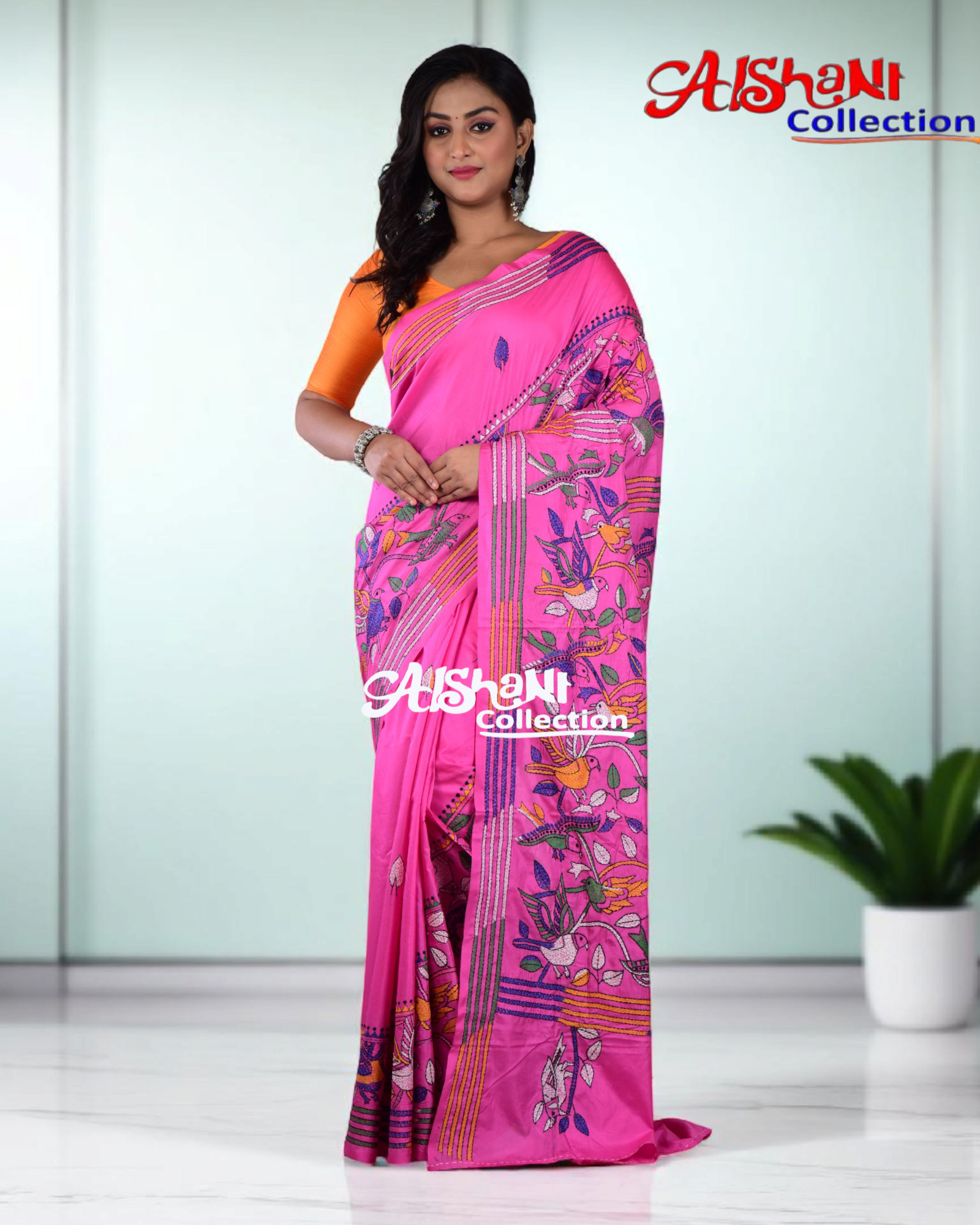 Elevate your ethnic charm with this Hand Embroidered Kantha Stitch Silk Saree, crafted on soft and lightweight blended Bangalore silk. Adorned with intricate multicolor thread embroidery, each motif reflects traditional Bengal craftsmanship, making it perfect for festive celebrations, casual gatherings, and wedding functions.