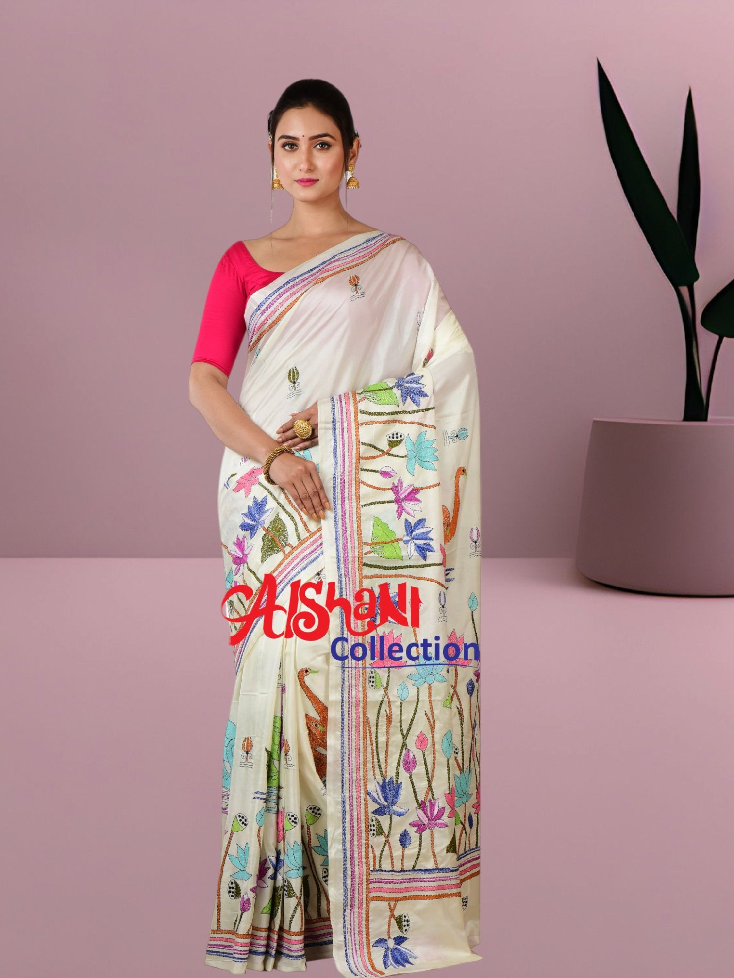 Elevate your ethnic charm with this Hand Embroidered Kantha Stitch Silk Saree, crafted on soft and lightweight blended Bangalore silk. Adorned with intricate multicolor thread embroidery, each motif reflects traditional Bengal craftsmanship, making it perfect for festive celebrations, casual gatherings, and wedding functions.