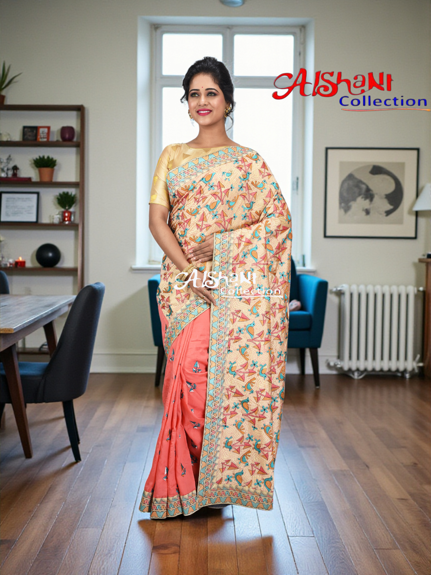 Discover timeless elegance with Aishani Collection’s Dupion Silk Machine Embroidery Kantha Stitch Saree, crafted to bring together heritage artistry and modern style. Made from luxurious Dupion Silk, this saree features intricate multicolour machine Kantha stitch embroidery inspired by Bengal’s traditional narrative art.
