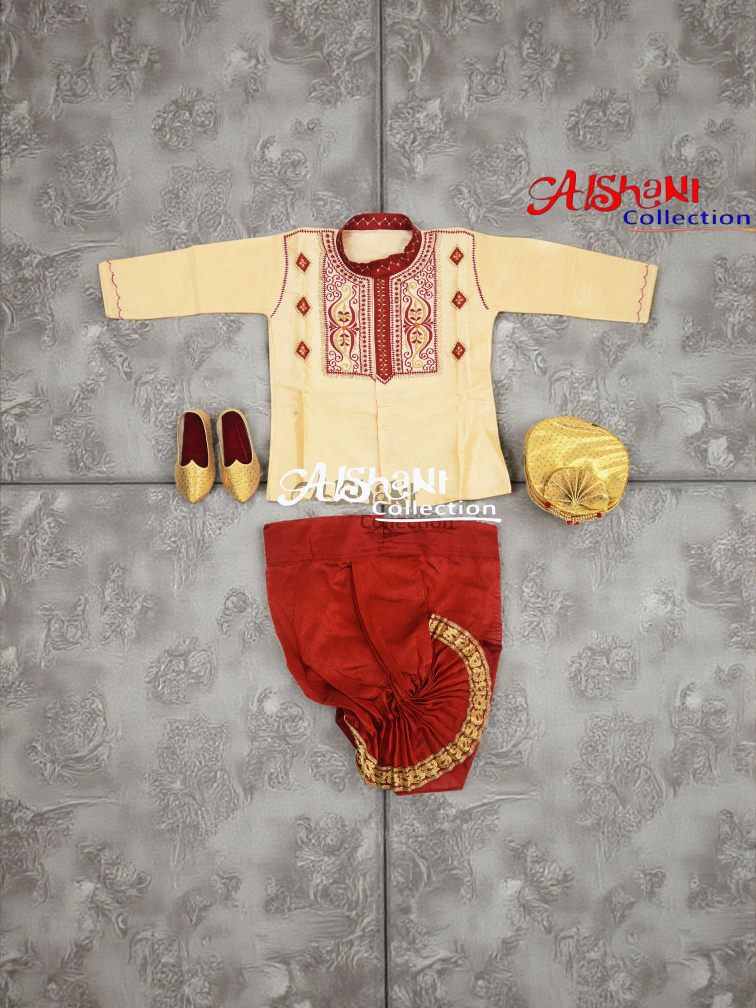 Introduce your little one to tradition with this beautifully crafted Silk Dhoti–Punjabi–Topi–Shoes Set from Aishani Collection, specially designed for Rice Ceremony (Annaprashan), birthdays, photoshoots, weddings, and festive occasions.