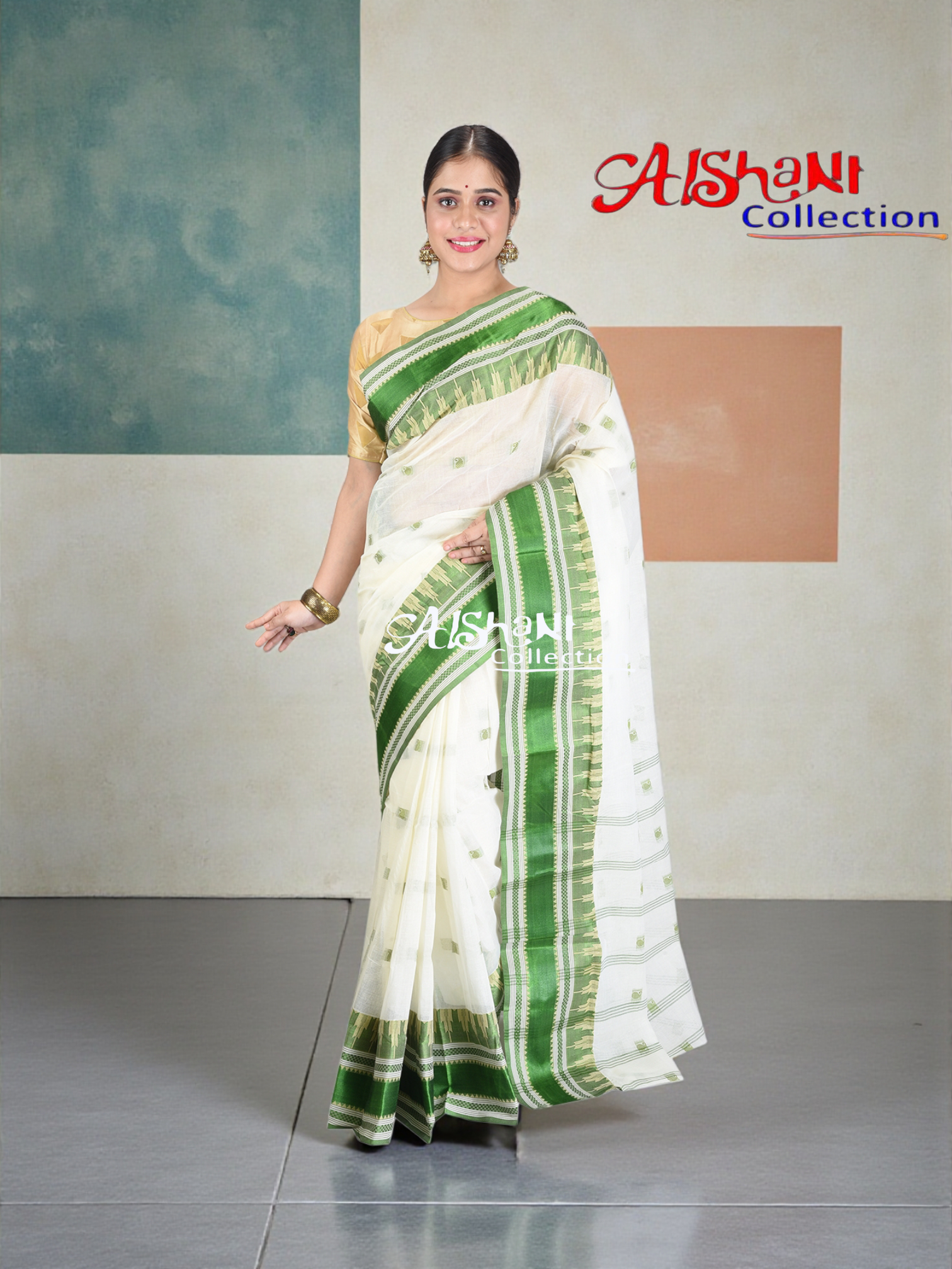 Pure Cotton Saree with Velvet-Look Contrast Border | Starch Added | Lightweight Traditional Bengali Saree | Without Blouse Piece (Green & White)