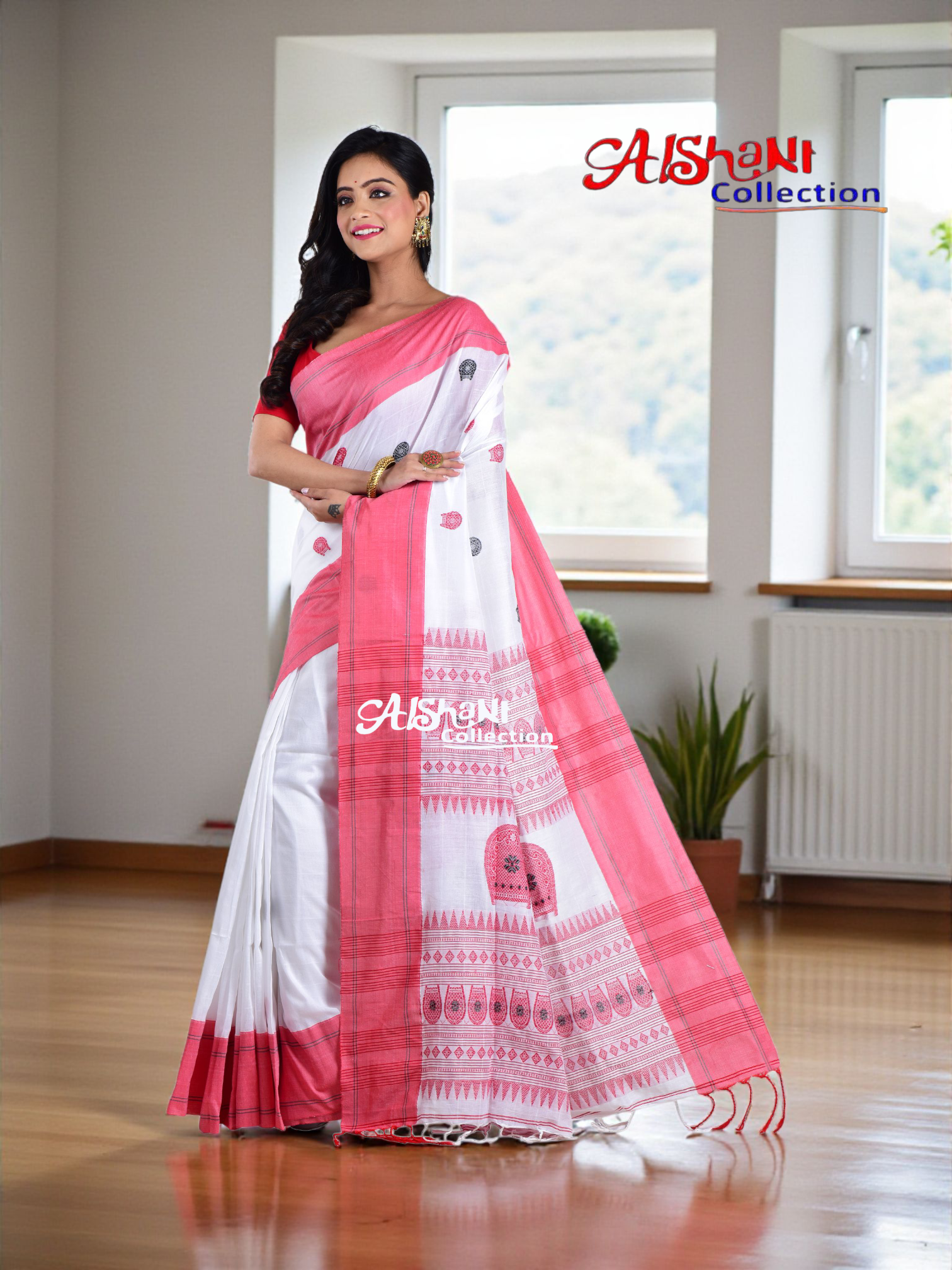 The rich white base paired with a striking Red border and finely detailed pallu adds an eye-catching dimension. The soft, breathable cotton makes it an ideal pick for festive functions, casual outings, and summer celebrations, keeping you cool and stylish all day long. Comes with a matching blouse piece to complete your look.