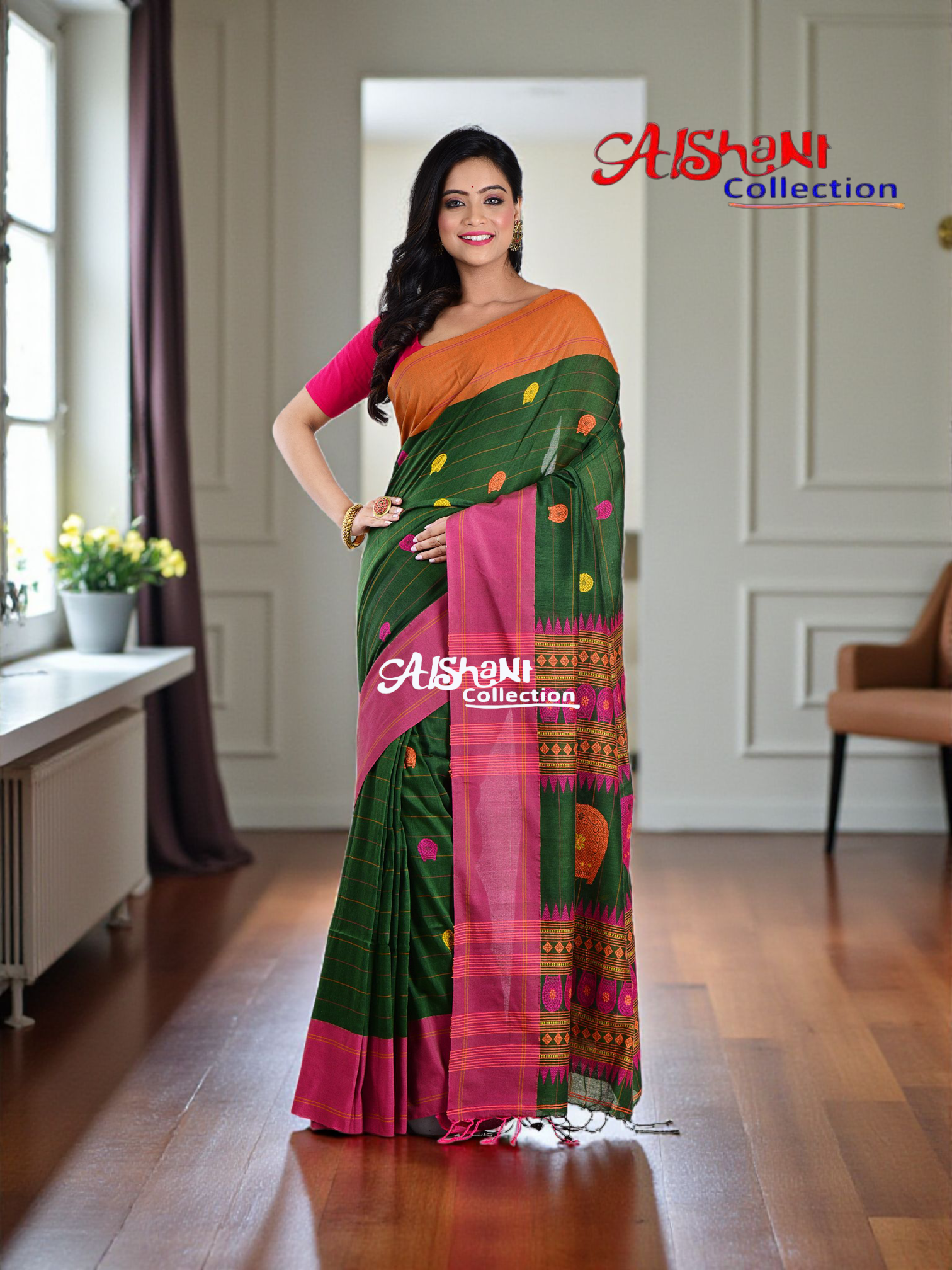 The rich green base paired with a striking pink-Orange contrast border and finely detailed pallu adds an eye-catching dimension. The soft, breathable cotton makes it an ideal pick for festive functions, casual outings, and summer celebrations, keeping you cool and stylish all day long. Comes with a matching blouse piece to complete your look.