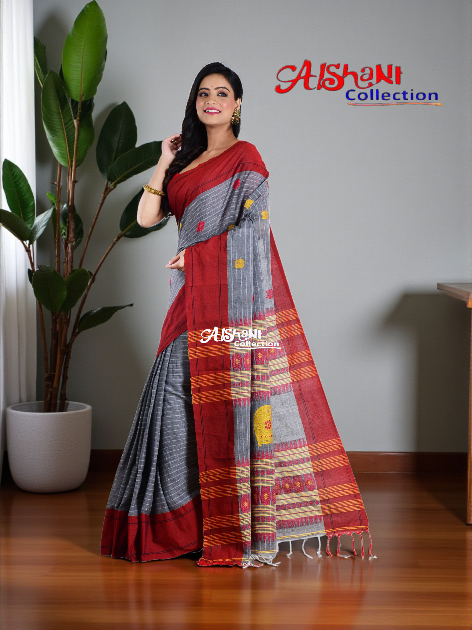 The rich Grey base paired with a striking Red border and finely detailed pallu adds an eye-catching dimension. The soft, breathable cotton makes it an ideal pick for festive functions, casual outings, and summer celebrations, keeping you cool and stylish all day long. Comes with a matching blouse piece to complete your look.