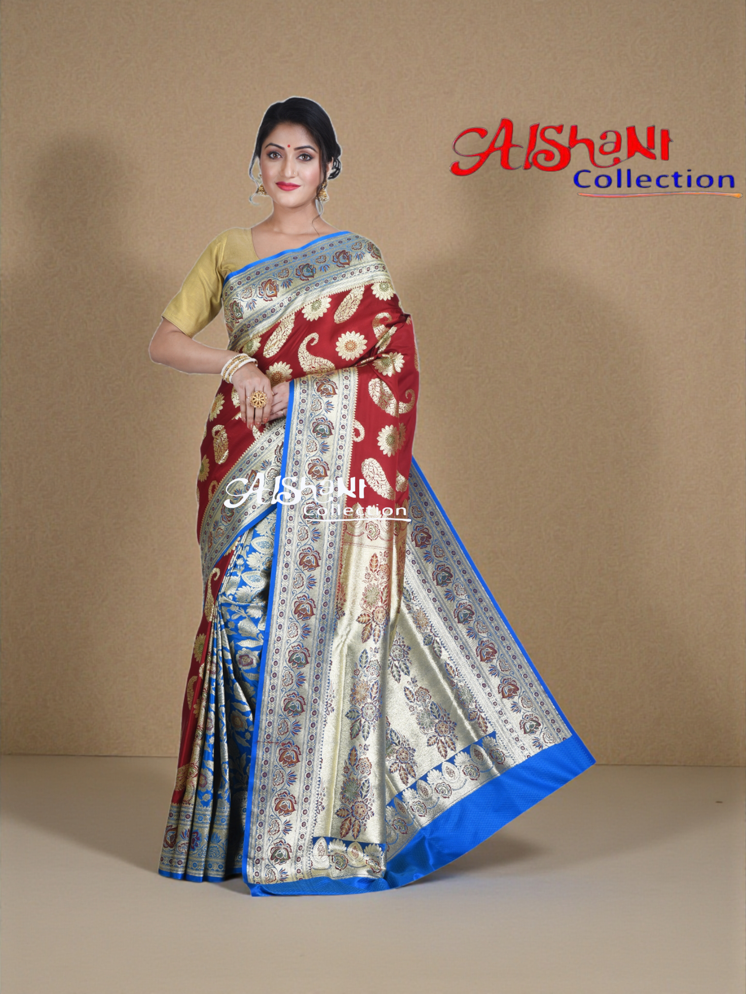 Step into the world of regal elegance with this Pure Katan Silk Banarasi Wedding Saree from Aishani Collection, exquisitely adorned with all-over Minakari work. Woven by skilled artisans, this masterpiece blends luxurious Katan silk with traditional Banarasi weaving and multicolour Minakari detailing that enhances every motif with depth and brilliance.
