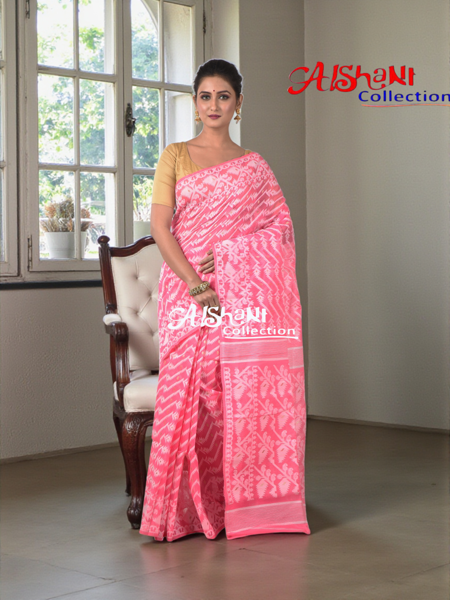 Woven Cotton Silk Dhakai Jamdani Saree Without Blouse Piece | Thread Work Bird Motif | Lightweight Traditional Saree (Pink)