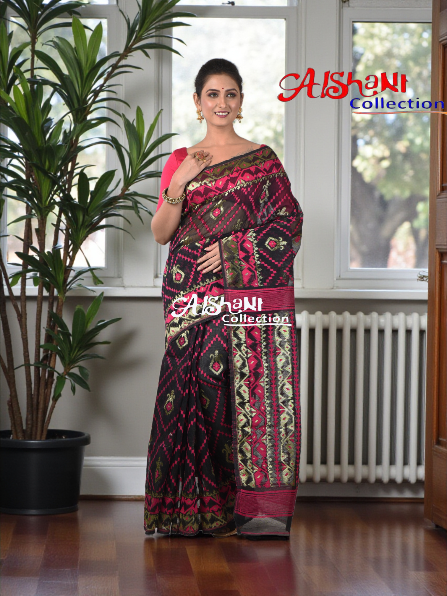 This saree comes without a blouse piece, keeping the look authentic and classic for those who prefer traditional Dhakai Jamdani styling.