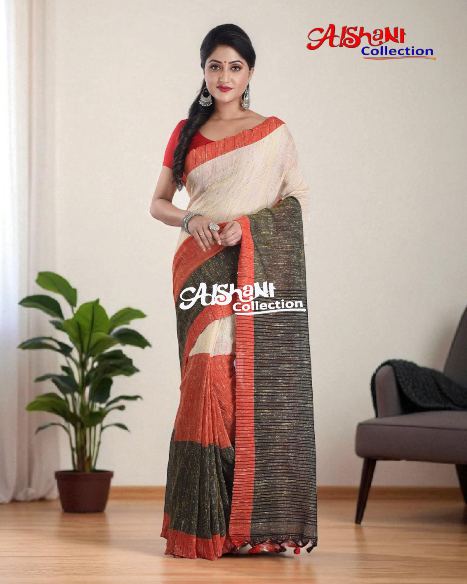Woven Jute Silk & Banana Fibre Ketia Handloom Saree – Natural Elegance with Traditional Charm | Aishani Collection (Red & Black & Beige))