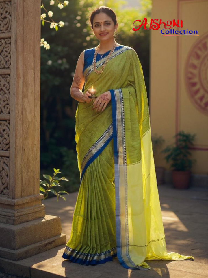 This **pure cotton handloom saree** features the signature **jacquard woven border** and classic **Khandi patterns**, known for their lightweight texture and refined aesthetics. The breathable fabric is ideal for all-day wear, making it perfect for festive occasions, office attire, or casual elegance.